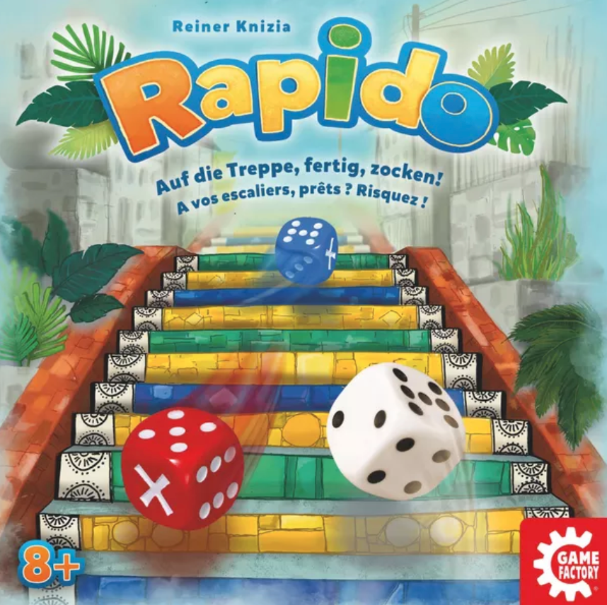 Rapido – also published under the names Excape and Exxtra above – is a silly, fast-moving dice-chucking game where players race to be the first to 20 points.