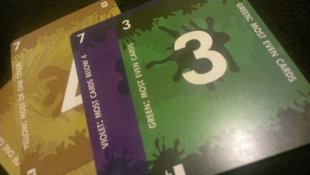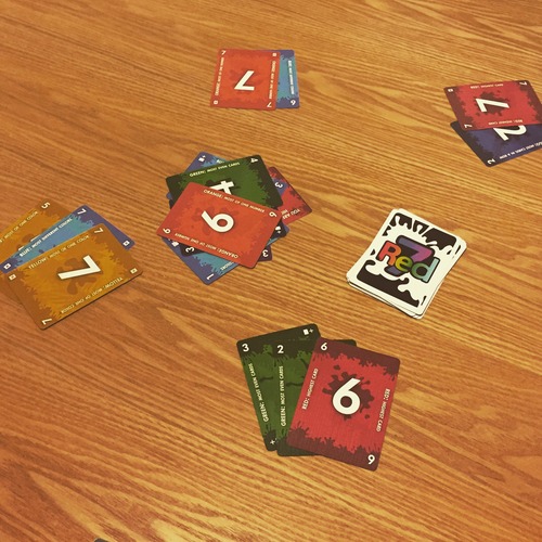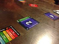 The deck is made up of cards in seven different colours, numbered 1-7 for each. Players start with a hand of seven cards from the (shuffled) deck, and one card face up in front of them. The game starts with the red card rule – highest number wins. So at the start of the game the person with the highest showing card is already in the lead (ties are decided by colour – red being the most powerful). The active player has three choices – they can play another card in front of them, play a card to change the rules, or play both. You change the rules by playing a card of a different colour to the centre. The colour of the card denotes the new rule and the rule always defines which player is in the lead: it might be the most cards of one colour, the most of the same number, the most cards in a run… each colour defines who’s winning in a different way, and you must be in the lead at the end of your turn – if you cannot find a way to do so, you’re out of the round.