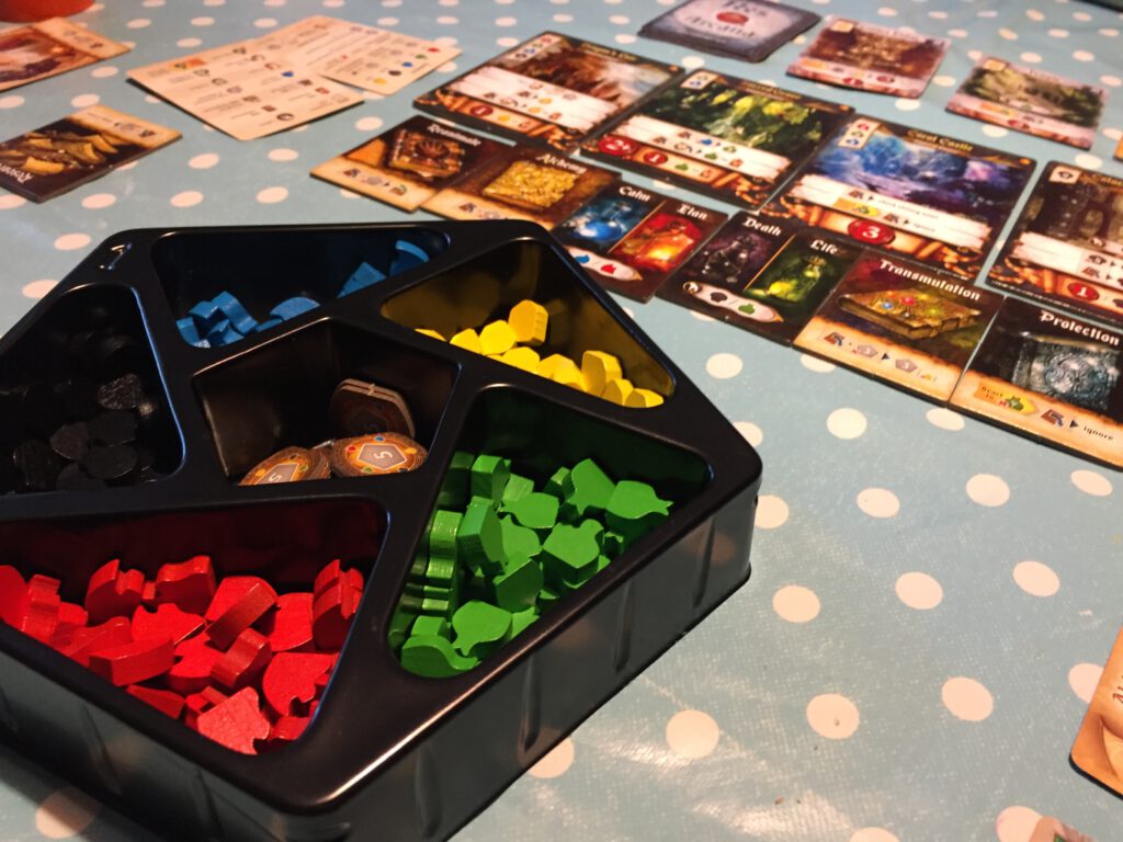 The game plays up to four but may well be best with two or three. All players begin the game with one of each essence: Elan, Life, Death, Calm and the much sought-after Gold (in practical terms these are red, green, black, blue and yellow coloured resources). Everyone is dealt two Mage cards and eight Artifact cards. They examine all of these, and once they’ve shuffled their artifact cards and deal themselves a starting hand of three, they decide which mage they’ll use for the game and play begins.
