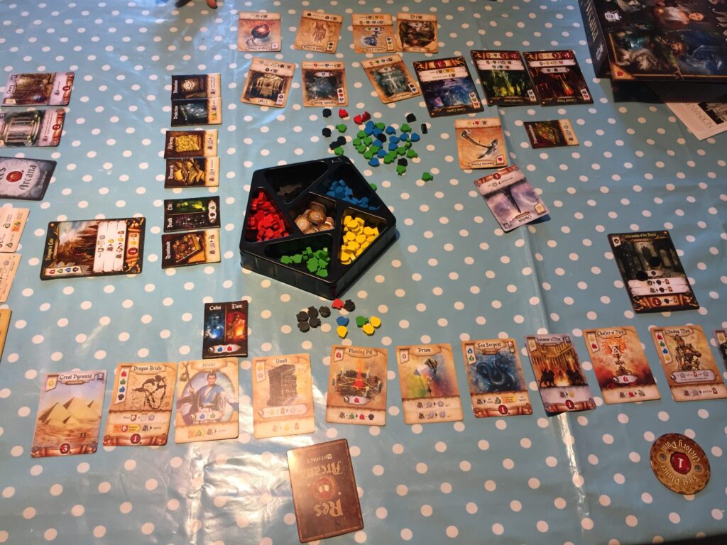 Res Arcana is really cleverly designed: in each game you only play eight cards at most, and yet there is a small-scale epic to be had off the back of it. The to-and-fro of cards-that-do-different-things isn’t the type of gaming I pine for, to be completely candid, and neither is the fantasy theme. But it has elicited multiple plays with my son and for that I can overlook such subjective preferences. Far less complicated that it initially appears, too: there’s one or two things we’ve glossed over here but the above covers most of the game.