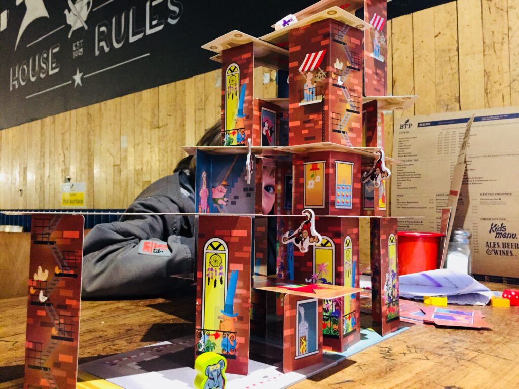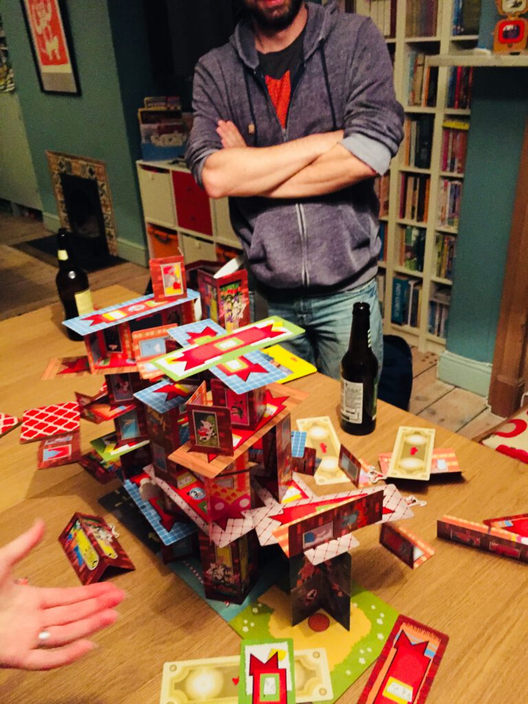 Three bases showing build points are laid out on the table, and each player takes a playing piece (Super Rhino etc) as well as three floors. Each floor shows a combination of walls, and on your turn you place the wall or wall as prescribed by your chosen floor, then place the floor on top of them. If your floor also shows a monkey, you must hang a monkey off the side of it too. These don’t do much, but they do contribute to the slightly surreal vibe – and can be placed to hinder other players.