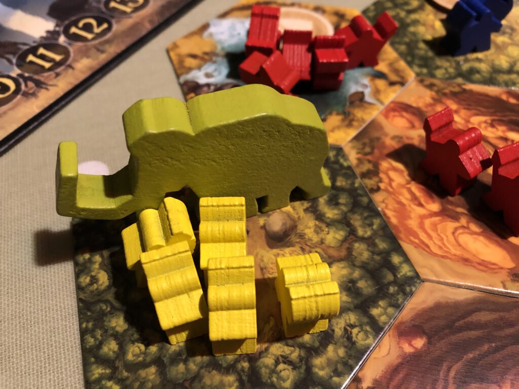 The second catch is that if you roll a double – two suns, moons, or blanks – an Event is triggered. These might be beneficial to you as well, or introduce some extra element to the board, such as a volcano or a woolly mammoth that can be hunted or tamed.
