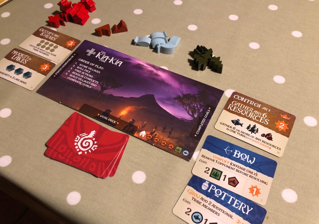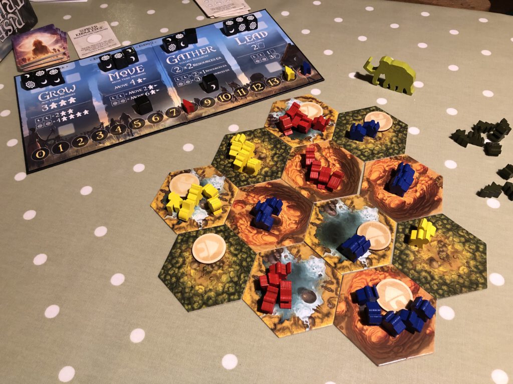 The board is actually made up of Landscape hexes, the number of which varies depending on the amount of players. Everyone starts with four tribespeople on a single hex, and sixteen more to be potentially added. On your turn you take two distinct actions from an available four: Grow sees you add more tribespeople to hexes you control, Move lets you migrate to other parts of the world, Gather allows you to harvest resources (stone, wood, food) depending on the hexes you occupy, and Lead is a kind of cultural advancement of your tribe – you get to flip some Objective cards that can be paid for with your resources. Some simply score points; others give you ongoing in-game advantages, such as the Horse to offer advanced movement, or the Bow to take out the enemy.