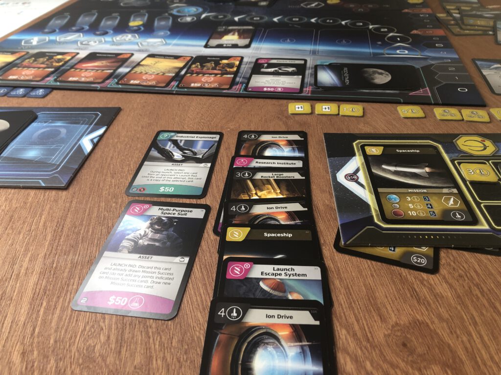 But this is where things get tense, because even having enough rockets in theory is no guarantee of success. Your rocket always starts at the bottom of the trail, and you firstly move it forward one space for each symbol in you have that matches the destination symbol: microchip symbols for Earth orbit, beakers for the moon and science for Mars. Then, your mission card tells you how many Mission Success cards you can flip over; usually 3 for Earth, 4 for the Moon and 5 for Mars. They’re called Mission Success somewhat erroneously, as there’s no guarantee of success – each card moves you 1, 2, 3 or – very occasionally – 4 spaces along the track. If you make it to your destination – success! You score points (extra points if you’re the first here) and take the bonus on the Mission card – a round-by-round reward of money, rockets, or a larger hand size of cards.