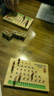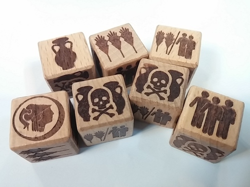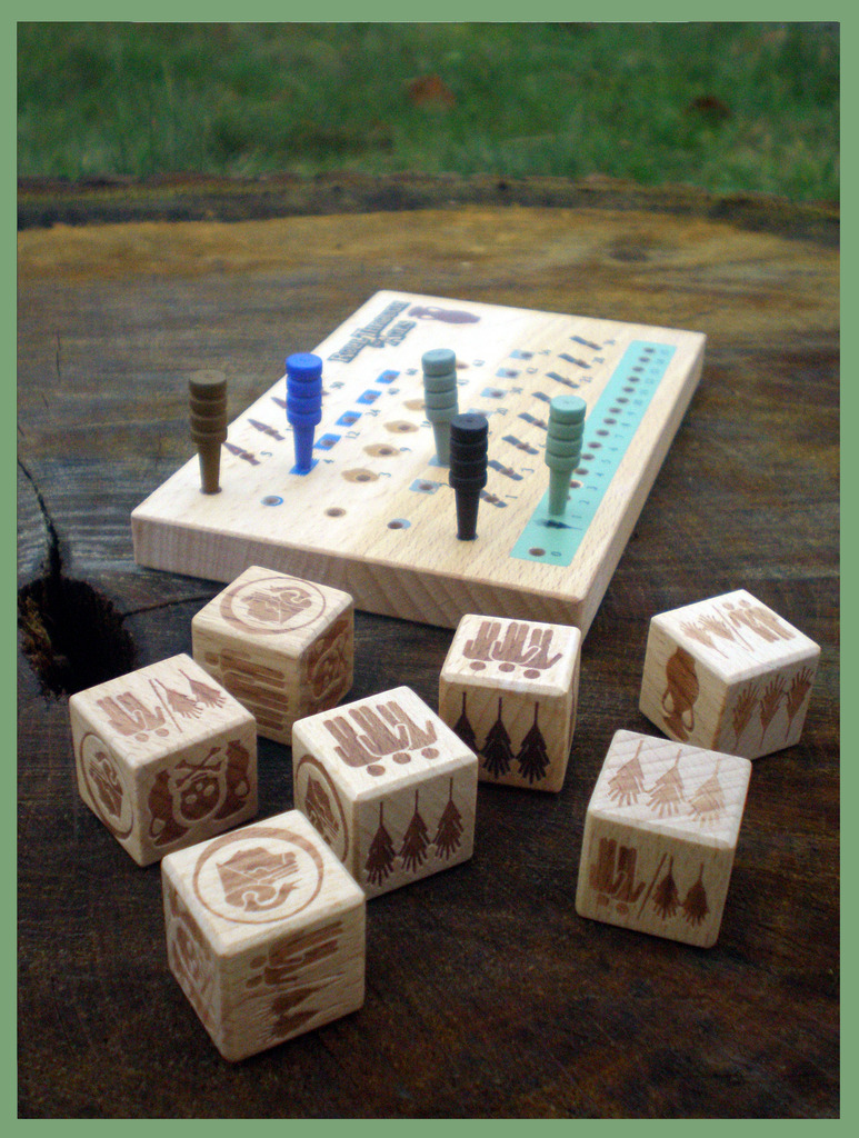 The game comes with a set of dice, a wooden peg board with with to record goods and food and a custom notepad with which to record how many cities and monuments you build. The idea is that you are each developing a civilisation, and how you do it depends on what dice you roll.