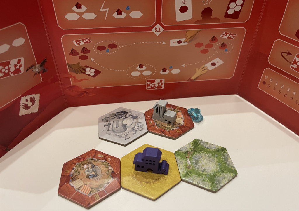 In Rome in a Day each player is building their own little landscape from the hexagonal tiles. At the end of the game, you’ll score points for each group of tiles multiplied by each matching building either on or adjacent to that group. But the catch is how these tiles are selected, which entails a series of I-cut-you-choose deals around the table.
