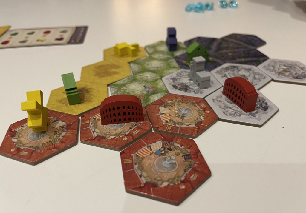 Once everyone’s gathered their tiles, you add them to your Rome in whatever way you like, with the caveats that you can’t move any tiles that were already placed in previous rounds, and buildings can never move from one tile to another.