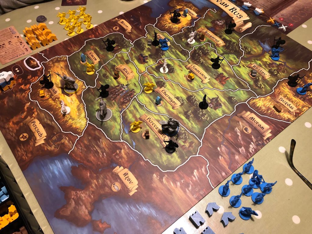 In the short term, however, the future might be a little more violent. Rurik: Dawn of Kiev plays over four rounds both on a map, and on an auction board. Players shrewdly – you hope – program your actions on the main board in order to manoeuvre into strong positions, but of course everyone else is trying to do the same thing…