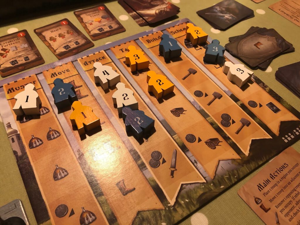 The board shows a map of the regions, with a certain amount of them being fought over depending on the amount of players. The concept of Rurik is actually pretty simple: in each of the four rounds you place workers on auction tracks that will allow you to do stuff on the map. Stuff like mustering troops; moving between regions, attacking your opponents (or the hapless Rebels), taxing the locals or building things: churches will convert enemies to your cause, markets will double the taxes you can levy, and strongholds help you defend your territories. There’s one non-map action too: Scheming, which allows you to pick up Scheme cards. Although many of them simply give you actions on the map as described above, the crucial thing here is your opponents won’t know what you’re up to…