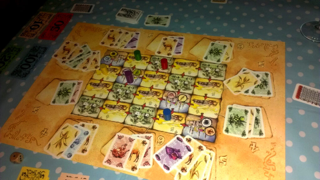 Fun is a wildly subjective component of course, and can take many forms, even to the same individual. But I found Samarkand slightly creaking with age: whilst it compares favourably to the likes of Monopoly, for what it is it feels a bit long: lacking in interaction and slightly draggy: for every fist-clenching turn there are a lot of rote ones. I think Istanbul does the movement of Samarkand in a more accessible (and attractive) way; and for trading I’d rather the more absorbing and interactive likes of Genoa or Catan.