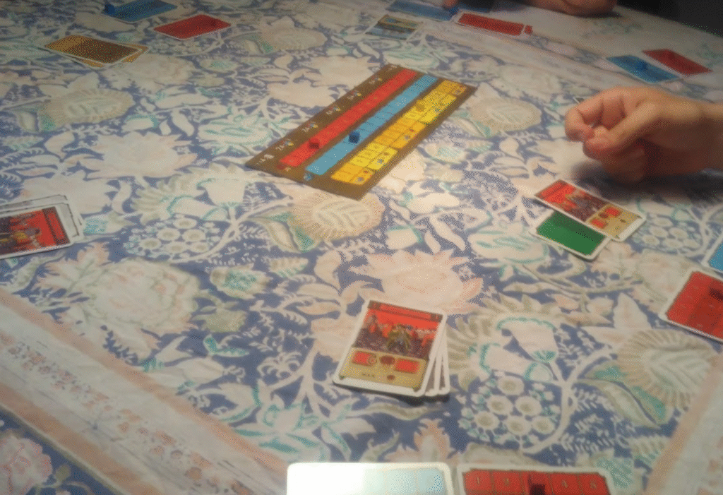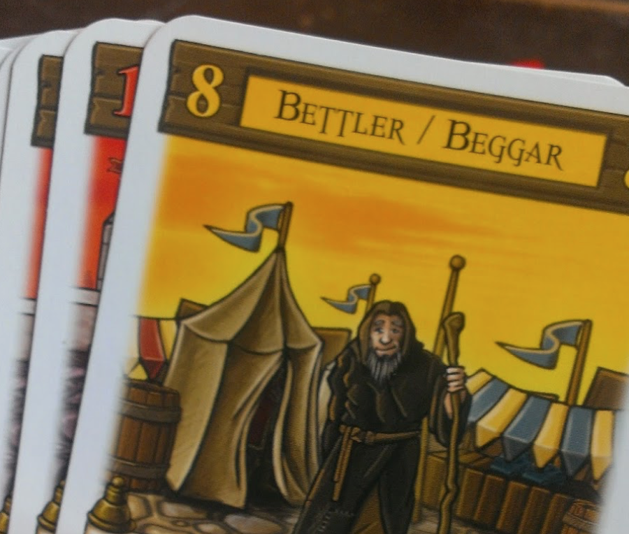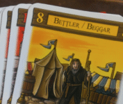 Finally the Beggar (No.9) nets you goods depending on how many players played Traders, and how many cards you have left in hand (the fewer the better), and returns all your previously-played cards into your hand. First player to thirty points wins!