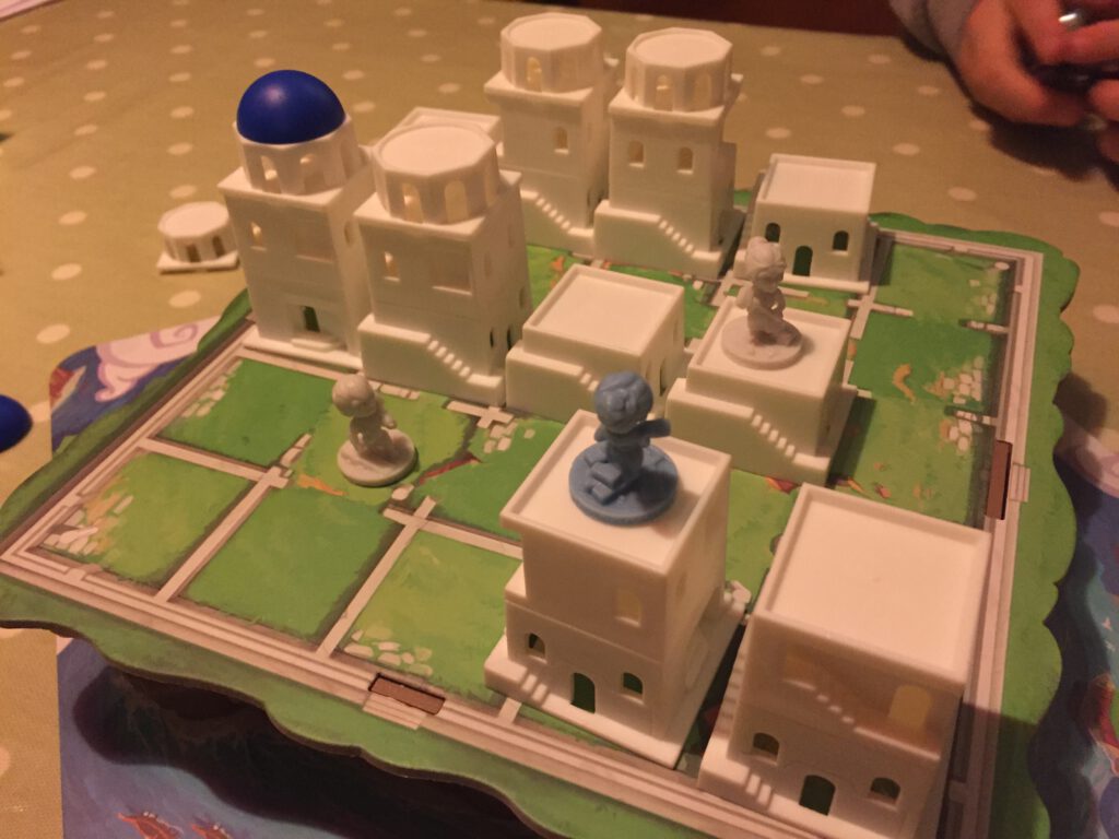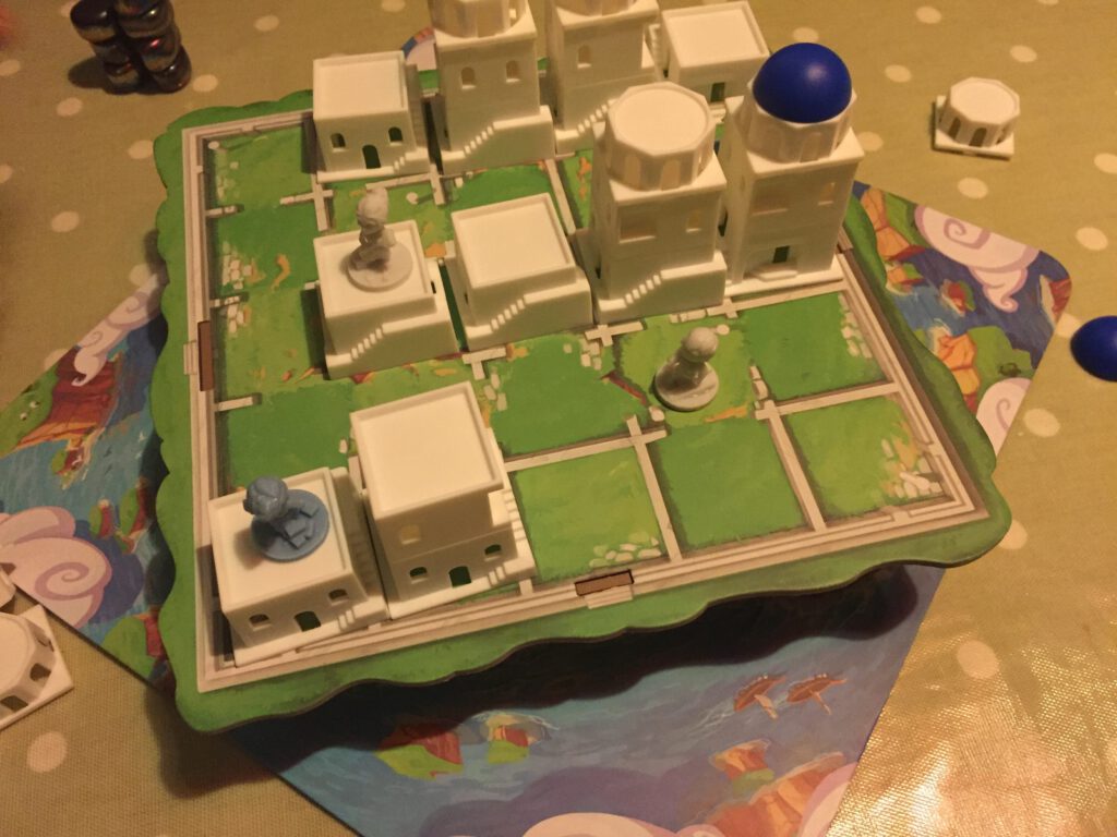 Santorini is an abstract battle that takes place on an 8×8 grid, as the players add buildings to it.