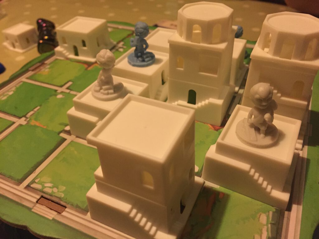At the start players place out their workers (two each in a two-player game) and then play proceeds with each player taking turns. On your turn you must first move your worker (one square in any direction) and then build on any adjacent square. When you build, you add another level to the growing buildings – there are three in total. When you move, you can always move up one level, and can move down as many levels as you like. The aim of the game is to be the first player to have a worker on a level three building – but! Other players can block you from doing so by placing a dome on a level three building, making it inaccessible.