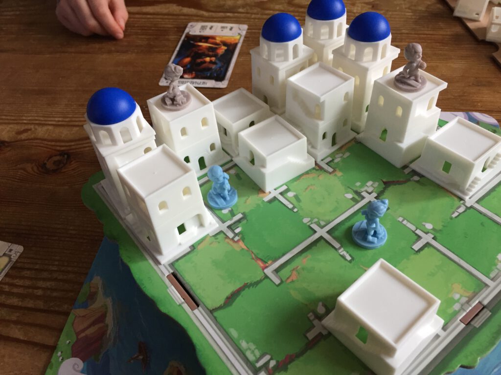 The artwork on Santorini’s box and cards did not draw me in at all – I’m really not a fan of those cutesy illustrations. But I can see why the publisher took this route to make the game appeal to children – it’s quite a special game that nippers can pick up and learn very quickly, but has enough tactical depth and replayability to keep adults wanting more as well. I’m not usually a huge fan of abstract games, but like Tak, this got under my skin in a good way.