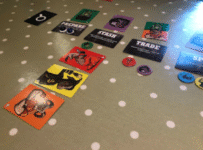 Play is reasonably simple – on your turn you move yourself (represented by a token) to one of four locations, and take the action there – you must move and can’t take the same action as on your last turn. The locations are all about sharing or stealing knowledge – players begin with two goat cards and use the locations to look at other player’s hands, swap cards with a player or swap a card with some communally-available ones. Critically, the non-scapegoat players are trying to make sure that when the time comes to dob in the scape goat comes, everyone one of them has a card of the scape goat’s colour: when an accusation is made, all non scapegoat players must reveal a matching goat card: let’s say for example, the scape goat is the blue player. Red accuses them, revealing a blue card. For the non scapegoats to win, Yellow and Green must also reveal a blue card. If they do – congratulations! You win, and the scapegoat loses. If someone doesn’t have a blue card, the accusation fails, and now blue knows at least one of you thinks they’re the scapegoat!