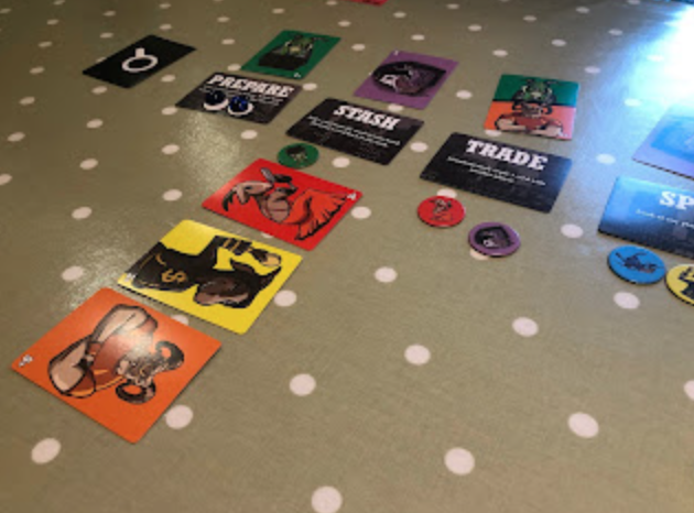 The catch is that as you move around the locations, you must drop off and pick up goat cards, exchanging one in your hand (of your own colour, if you have it, but if not any colour you like) with the goat card that’s there. So if the blue player notices that people are picking up blue cards and leaving behind other coloured cards – such as green – rather consistently, they may suspect they’re the actual scapegoat, even though they were told green is. So on their turn they can run to the cops, and if they do so before the other goats accuse them – they win!