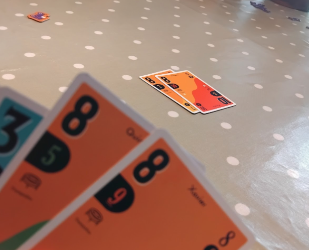 The next player has a choice. If they can (and want to) beat the previous card or cards, they play their own to the table and claim the previous player’s cards as points: 1 point per card. If they can’t (or choose not too) they can scout: taking a card from either end of the played set and adding into their hand in whatever position and orientation they like. The scouted player gets a point, and their set is now weakened: for instance, three 8‘s become two 8‘s. The scouting player can create or strengthen a set in their hand, making it easier to play next time. Once per round, you can scout and play on the same turn: timing this can be critical!