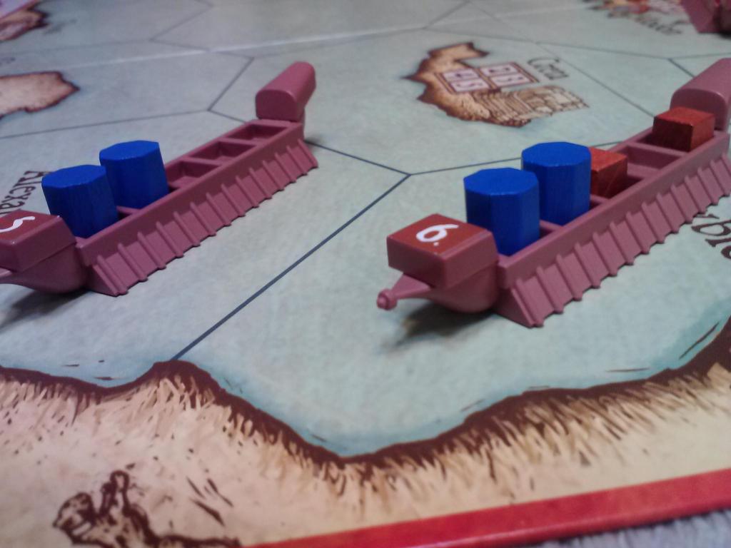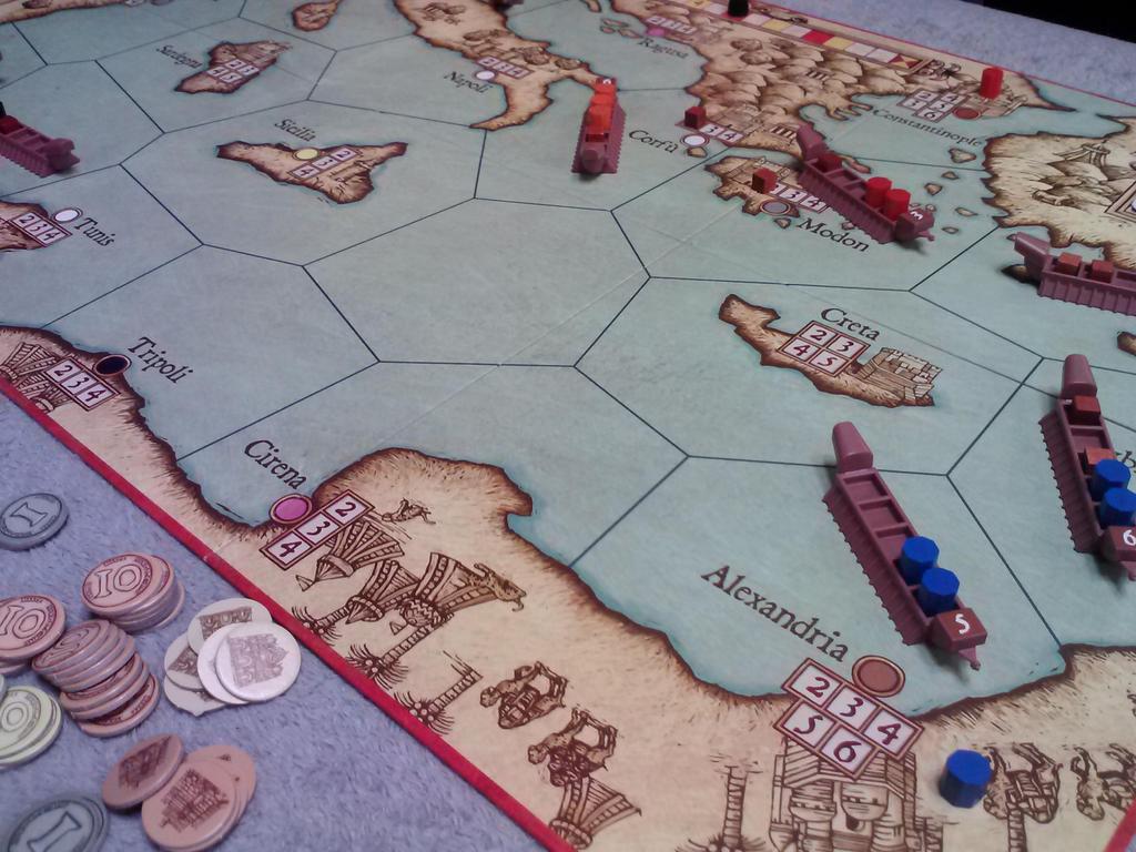 There are four starting positions on the board, which shows the Mediterranean and surrounds. Players can be Spanish, Turkish, or one of two Italian peoples, as they begin the game with an empty boat and some money to buy goods and hire sailors.