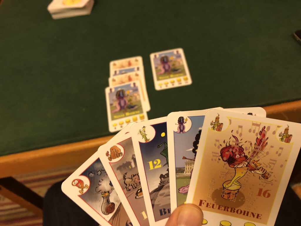 Harvesting is sometimes enforced; sometimes optional. When you’ve collected a certain amount of beans you can cash them in: the top card denotes what a set is worth (garden beans for example are worth a little more than fire beans) and so being forced to harvest when there is a Sissibean at the top of the pile can sometimes cost you cash. Cards are flipped over to become money, and leftover cards go into a discard pile. When the draw deck runs out, the discards are shuffled to form a new draw deck, and when the draw deck runs out for the third time the madness ends and the player with the most cash wins!
