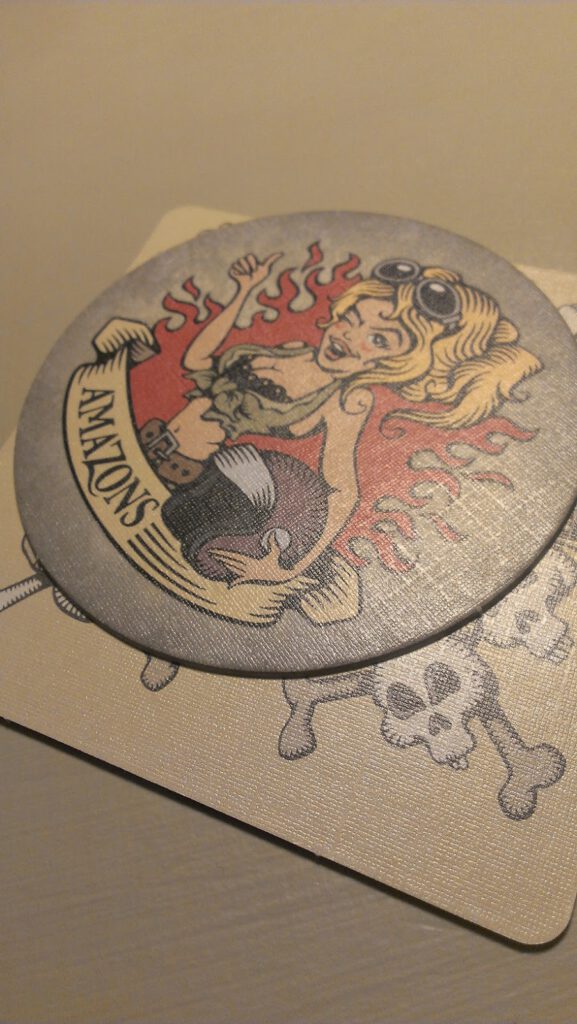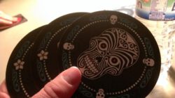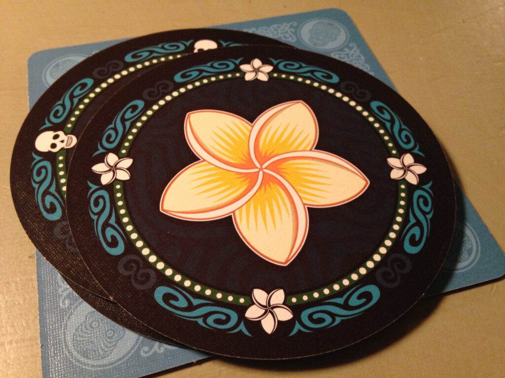 Each player begins with one square cardboard mat and four circular ones. The round mats are used during play and the square mat to score. Three of the round mats have flowers on them, and one has a skull. At the start of each round everyone plays a circular mat face down on top of their square mat. They may play either a flower or a skull. Then the starting player has two choices – they can add another mat on top of their original one, or they can bid; which means a guess as to how many flower mats they can flip over without encountering a skull. If they add another mat, the choice of adding or bidding moves to the next player.