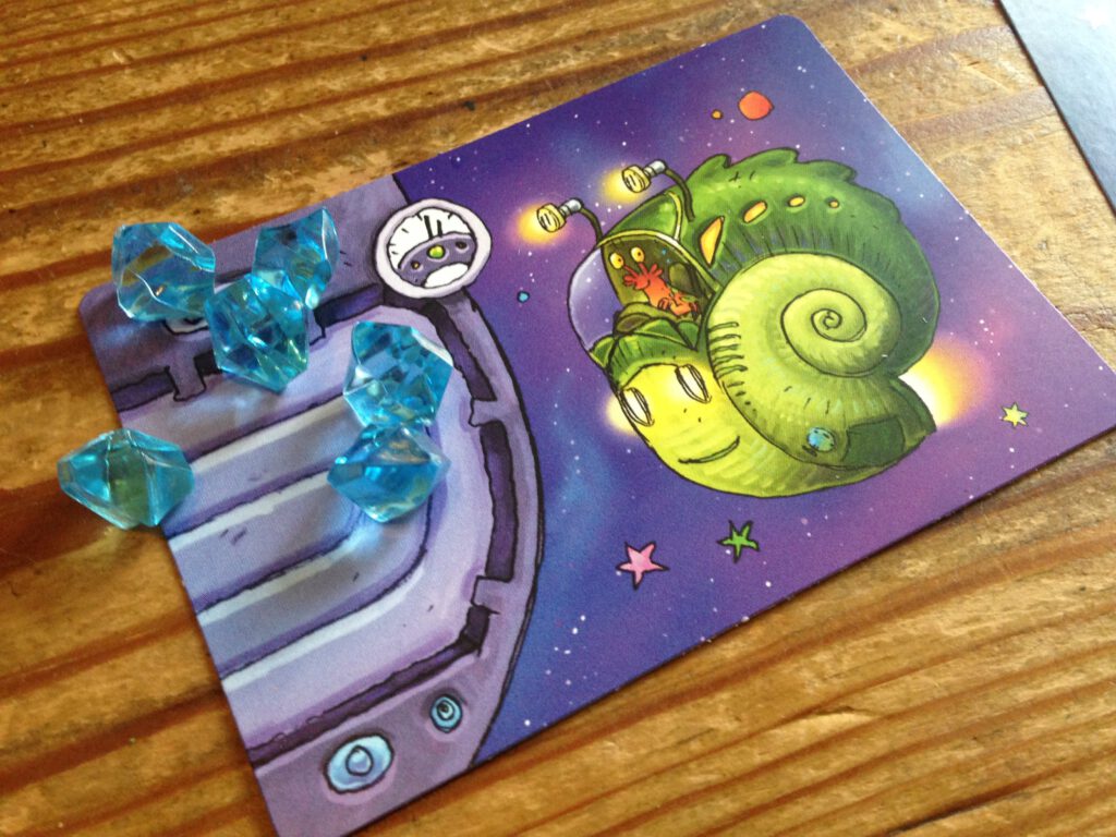As soon as one player gets to five planet cards in their stash, the other players have one more turn and the game ends. Players count up their explorer points and the player with the most wins (unused fuel is also worth 1 explorer point for every two crystals)