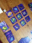 Space Planets is fun to play for or with kids. Nine of the planets in question (cards) are laid out as a 3 x 3 grid, with about a die’s width between them. The planets each have an explorer point value on them, and higher is better in terms of winning the game. Each player starts with four fuel crystals. On your turn, you roll a die, and try and get it to stop on one of the planets.