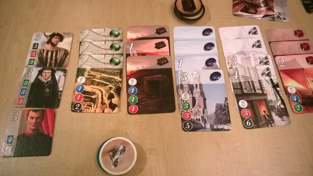 Cards are laid out in the centre of the table in three rows of five, one row from each deck. ‘A’ cards are easy to buy, but rarely provide points. ‘B’ cards cost more but usually provide a few points, and ‘C’ cards are hugely costly, but offer big points. The cost for each card is a combination of gems, e.g. 3 blue, 2 red and a black.