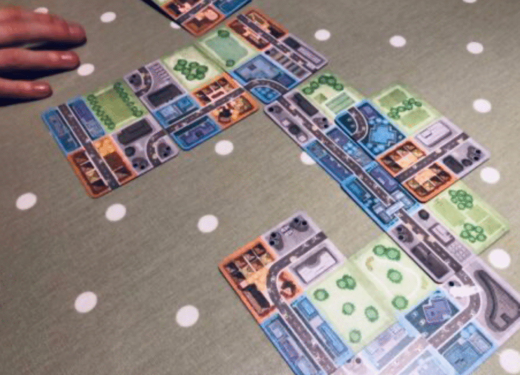 Sprawlopolis is a deck of cards: every card has a sprawl side (with which to build your town) and an objective side. Before play begins, three of them are flipped onto their objective sides and form the criteria for points-scoring in the current game. Then the game itself is merely the placing of cards on their sprawling side – every card is made up of up to four different categories (residential/commercial/industrial/parks) as well as a road or two. Cards can be placed adjacent or overlapping a half or quarter of previously-placed cards.