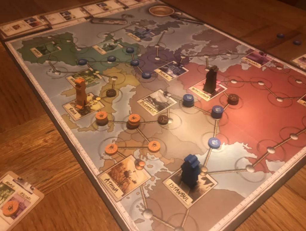 If you take this second option, you may first move your spy to any city on your network, then use your agents to establish a network to a new city from the one your spy is in, and move your spy to that new city. As your spy travels from city to city, your agents are also used to check off destinations on your mission cards, which each need a number of agents assigned before the mission itself is complete, and all the agents are back at your disposal.