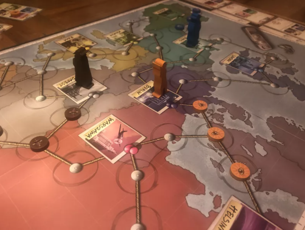 Spy Connection is a game of making connections: of moving your spy around the map to specific destinations in order to complete missions, for points.
