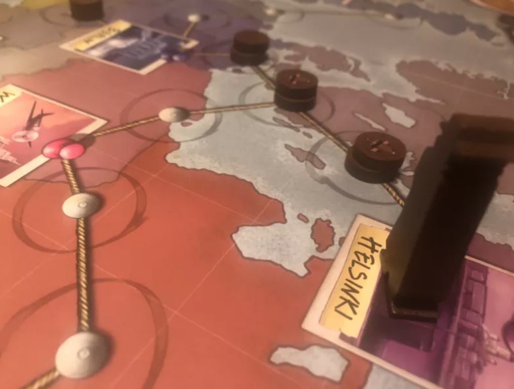 You can do two things on your turn: pick up a mission card from the display – you can have multiple missions on the go – or expand your network/move your spy. There’s a big wooden piece on the map – your spy – and lots of little discs – your agents – that have several uses, but the main one is establishing connections between cities. Note that connections between cities can be shared by multiple players, but it’s cheaper for the first player to make the connection, as they only need one agent for every step on the route. If there are already agents there, you need to place two instead.