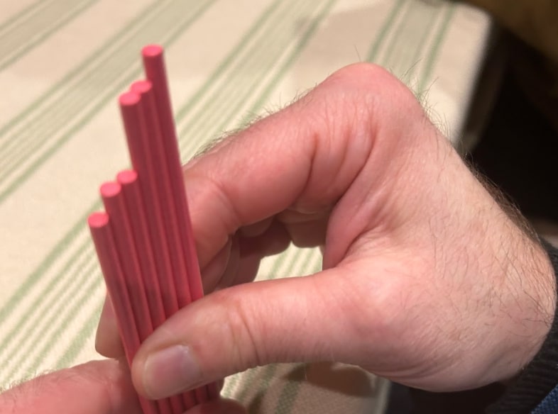 Players start with 100 money, which is tracked on a shared board, and a single stick in their hand. In each round a new stick is drawn from the box and everyone bids on it until all but one player has passed: the winner gets the stick, pays their money, and a new round begins. The catch is that each new stick is placed in the middle of the table (a small holder is provided!) and you have to judge the length by eye from where you’re sitting: with such a small difference in length between the sticks, this judgement is a pivotal part of the game.