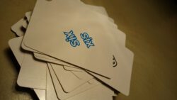 In each round players are trying to get rid of their cards by placing them on top of an ever-growing discard deck, as the first player out wins the round, and will have less cards to get rid of in round two. But the brain-melting comes in here – in round one, you have to add a card that the top card on the discard deck describes. In round two, you have to add a card that describes the top card instead!