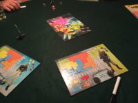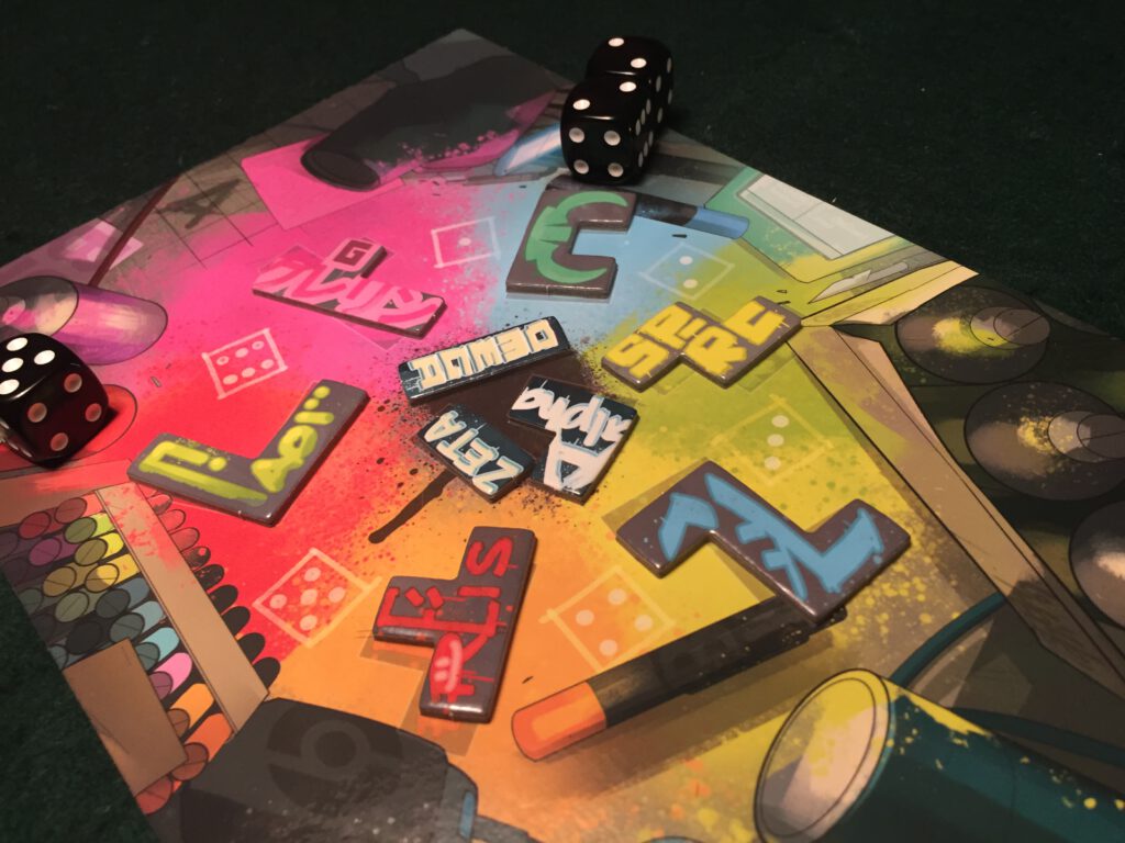 In Tag City you’re painting the town red – and a number of other colours, as you make your way across the town graffitiing your spray-can art on all and sundry. How this occurs is through the medium of dice and wipeable boards.