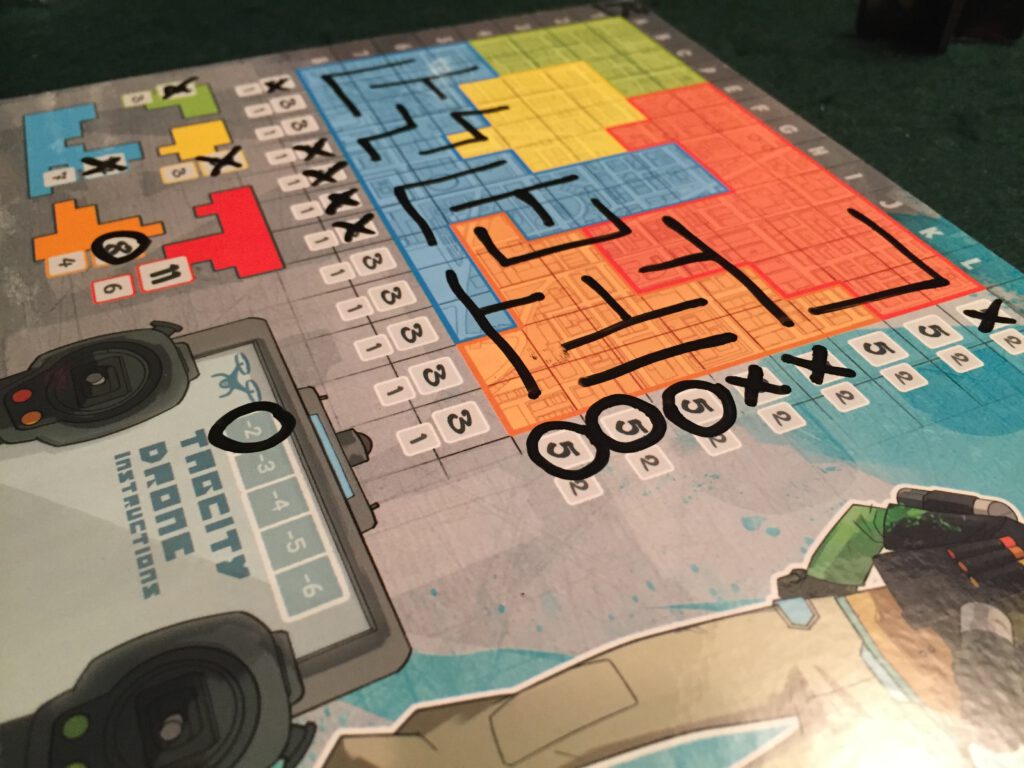 So what are the decisions based on? Each turn someone will roll dice and assign them to some tetromino shapes from an available pool. On your turn, you take a die and fill in the matching shape on your board – the shape can be rotated or flipped, but it must be filled in in full. If you can’t or don’t want to take a shape, you can play a drone instead – these cost you points, but let you choose any shape on the board – including the small ones for hard-to-fill spaces. In fact, drones are the only way to access these!