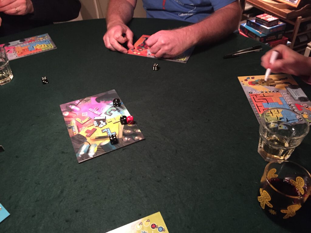Each player begins with their own board broken up into a grid, which you’ll be filling up during the game: be the first to fill a column for three points. The first to fill a row gets five points. And the first to fill one of the coloured areas gets even bigger bonuses, meaning each decision you take matters.