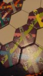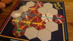 The tiles display three numbered lines – one vertical, and two diagonal. If you manage to establish an unbroken line of the same number from one side of your board to the other, you will score this line at the end of the game – the numbers go from 1 to 9, and as the tiles score their face value (of the unbroken lines only) a line of nines would obviously be more valuable than a line of ones. (Phones may be helpful to calculate scores!)