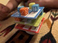 While this doesn’t have the bonkers fun of Misfits or Bandu – where the sheer variety of pieces mean a variety of architectural wonders can be built – it’s easy to teach and, if you ignore the slightly over-sized box it comes in – highly portable. It’s also quite funny, with a sense of drama and luck-pushing as the options run out just as the tower gets increasingly unstable. Good fun.