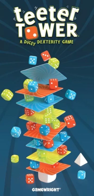 Teeter Tower is a co-operative stacking game where the goal is to use up all of the dice without the tower collapsing – if you can achieve that, you win. If the tower falls… you don’t.