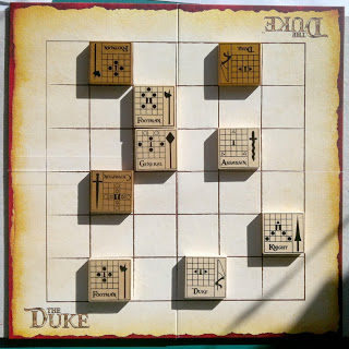 The Duke is a game I respect rather than relish; but that’s a purely personal thing. I don’t have any objective critiques to make of it; it does what it does very well, and lovers of chess and other abstract games such as Go will find a lot to appreciate. I’d say the drawback for lovers of open information is that you don’t know what you’re going to draw from your bag, and this can lead the game to feel slightly dependent on chance.