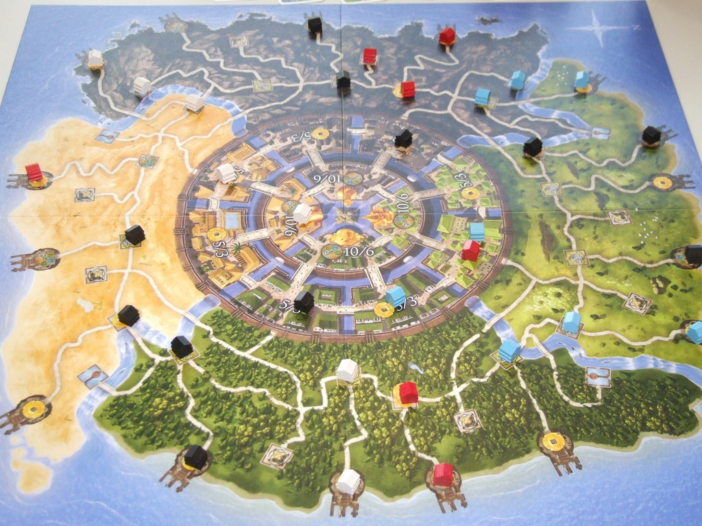 The board shows the island; divided into four geographic regions and with the titular city at the centre. Dotted over the landscape are towns which are connected by roads – starting at the coast, you build trade houses in these towns and then, one connection at a time, make their way inland building trade houses as they go. Your aim is to collect the most Letters of Recommendation (hereafter referred to as points).
