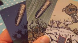 Each player is dealt a hand of 3 cards by the starting player (the mission leader) and the remainder are split into two piles, representing trials – the trials of war – and morale. Your job is to to empty the trials deck – surviving the war – before the morale runs out.
