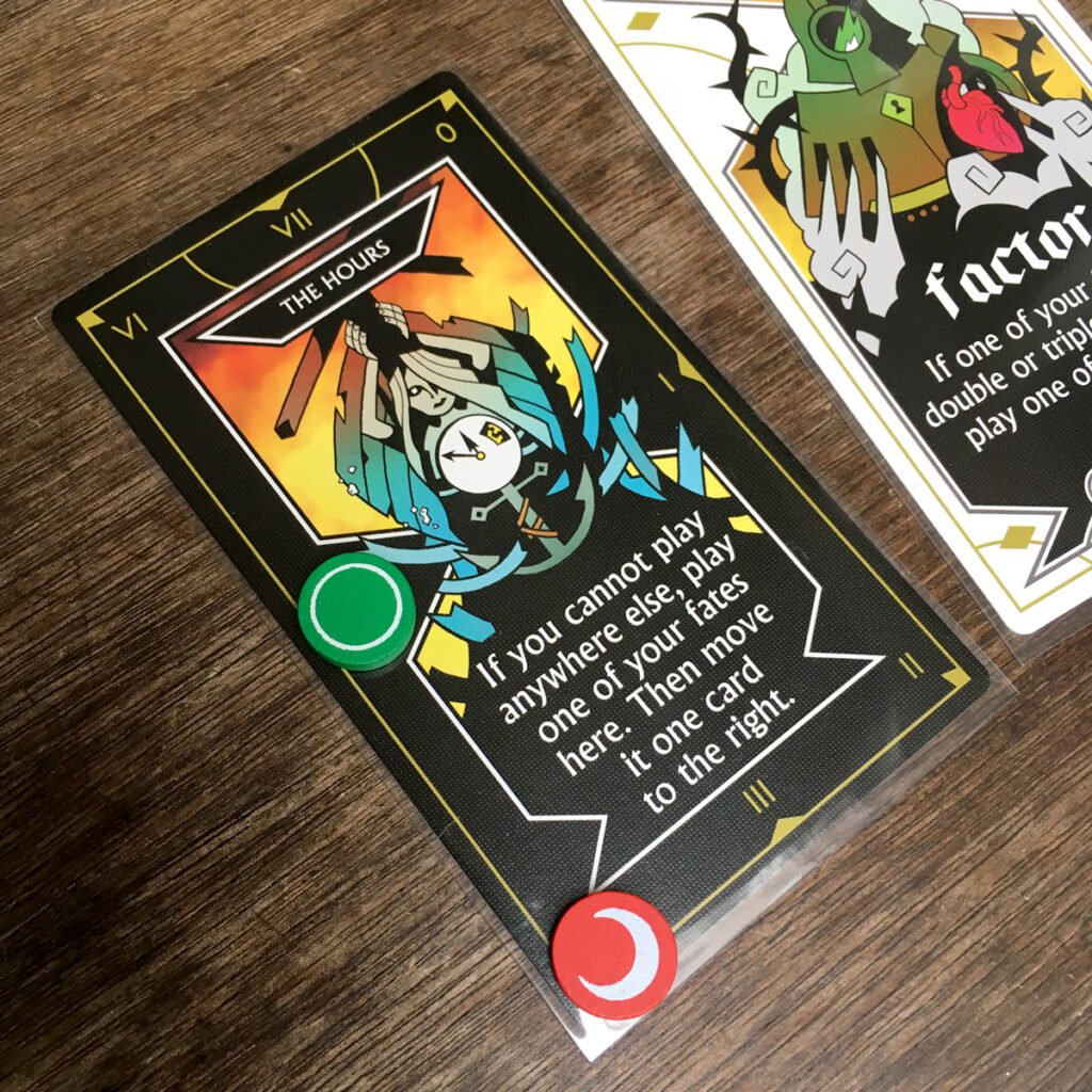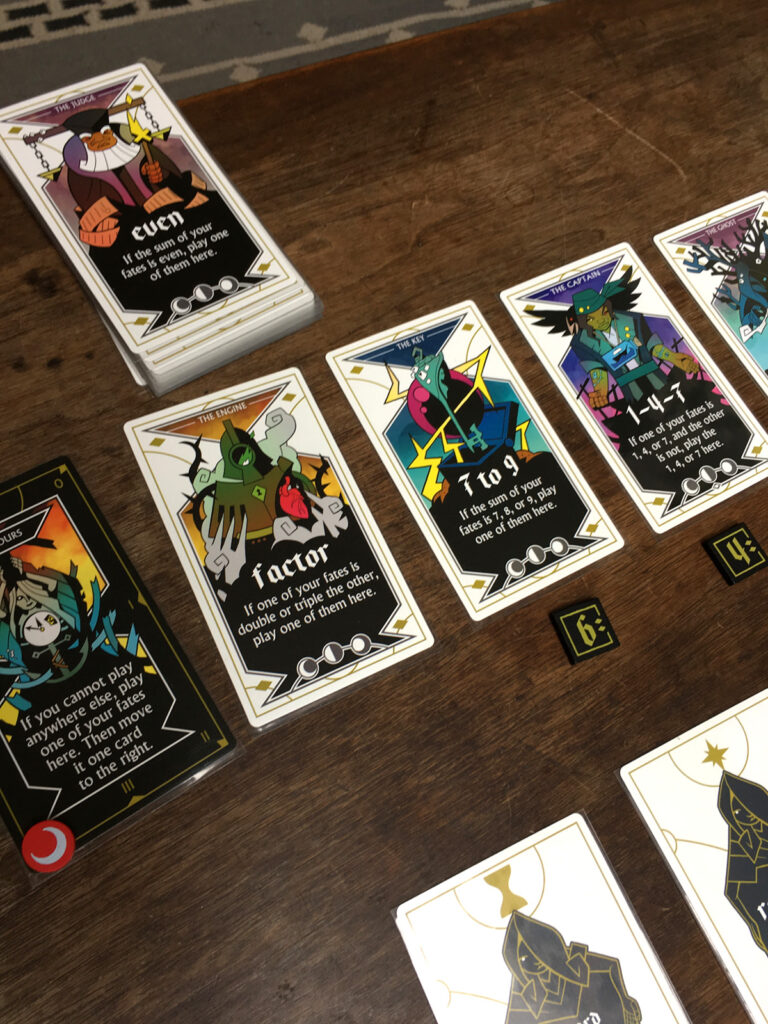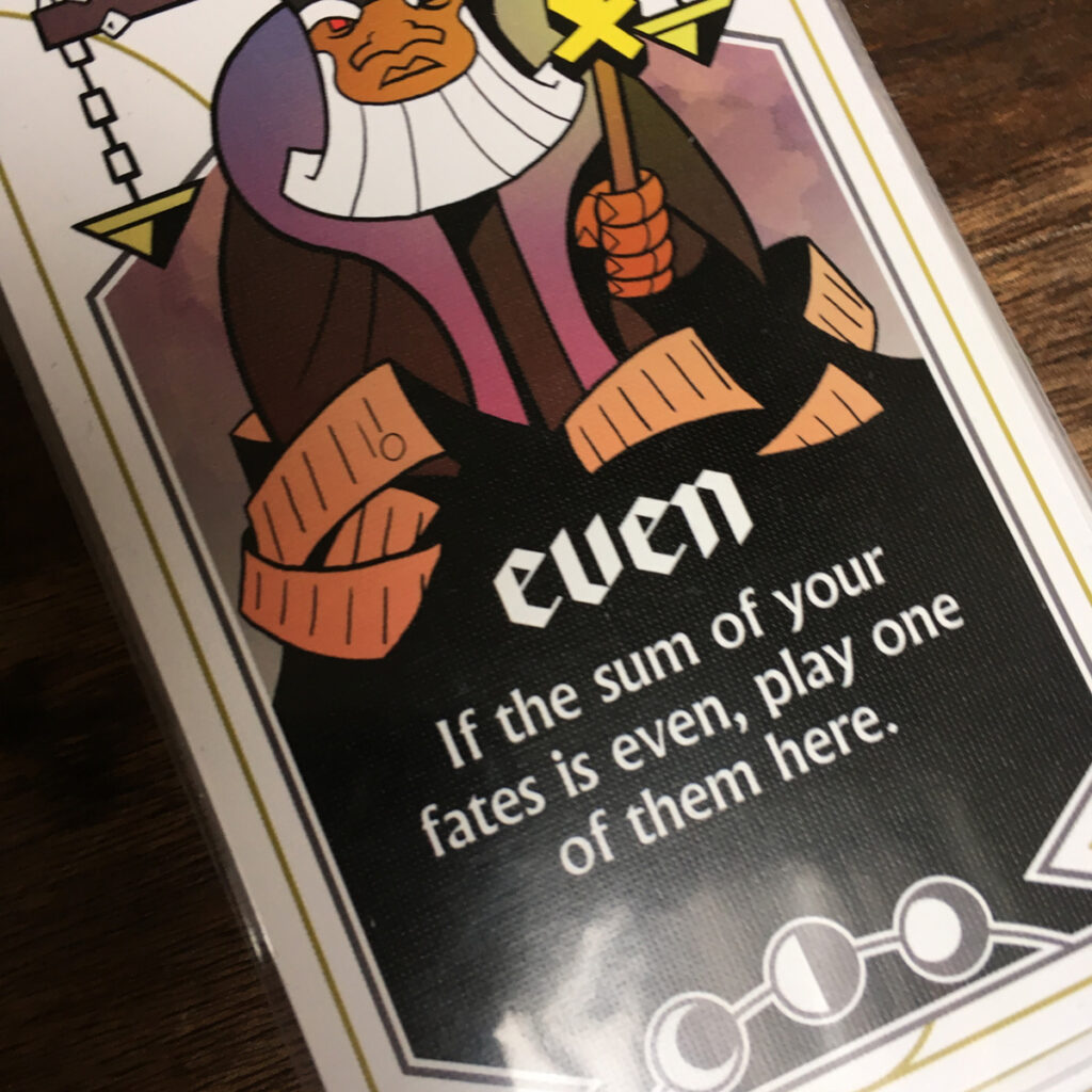 The cards have conditions on them, or other, similar instructions. For instance, one card says “If the sum of your fates is 5 or less, play one of them here”. Another example: “If the difference between your fates is equal to a visible fate, play your higher fate here.”
