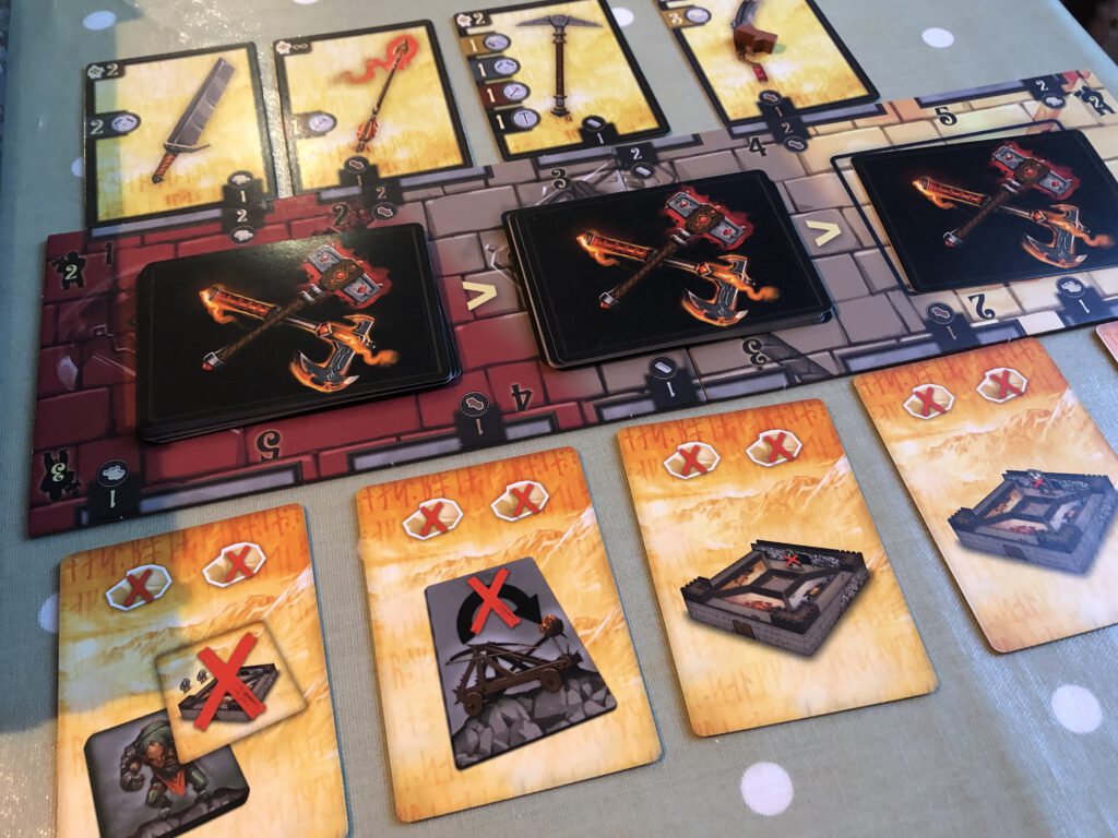 Runedar has a clever sense of escalation to it: whilst the players get more powerful (-the new cards) the waves of attacks from outside increase as well, and there are additional risks of attacks via siege tower and the enemy catapult potentially eliminating the ability to get new cards. Handling these threats is critical to success! Last, but far from least, mixed into everyone’s decks are two Orc cards. These are a problem not just because you can’t use them for actions – they just get in your way – but also because they prompt the arrival and/or advance of the attacks on the tower: the top card of the orc deck is flipped which determines where – if any – new attackers arrive, and whether existing attackers advance: onto the walls, into the tower proper, perhaps even snaffling up your precious gold…