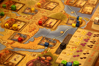 The board shows a map of the Middle East, with players starting in Venice and theoretically making their way to Beijing. However, such are the multitude of options in Marco Polo, you may decide to pretty much ignore travelling entirely, and simply trade instead. Or you may combine the two.
