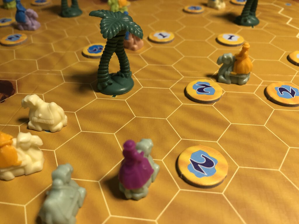 Placing a camel next to an oasis scores 5points, but bear in mind if you already have a camel next to the same oasis of the same colour, you can’t claim this bonus again. Placing a camel on a watering hole simply hoovers up the points placed there. Creating a caravan route that blocks off a part of the board from the other players – with no other players within the barricaded area – will score you a point per hex of the claimed area: tricky to pull off, but with huge potential gains. The final way to score points is by having the longest caravans of a given colour (10 points!) when the game ends, which is usually when the camels of any colour run out.