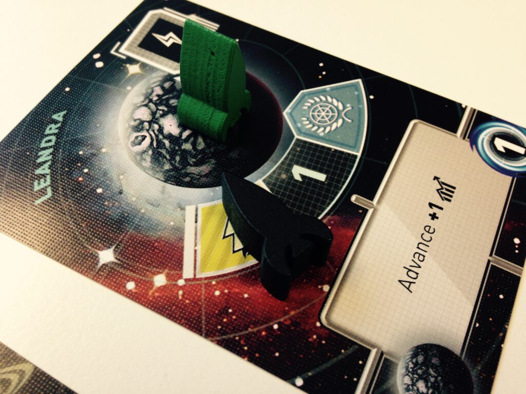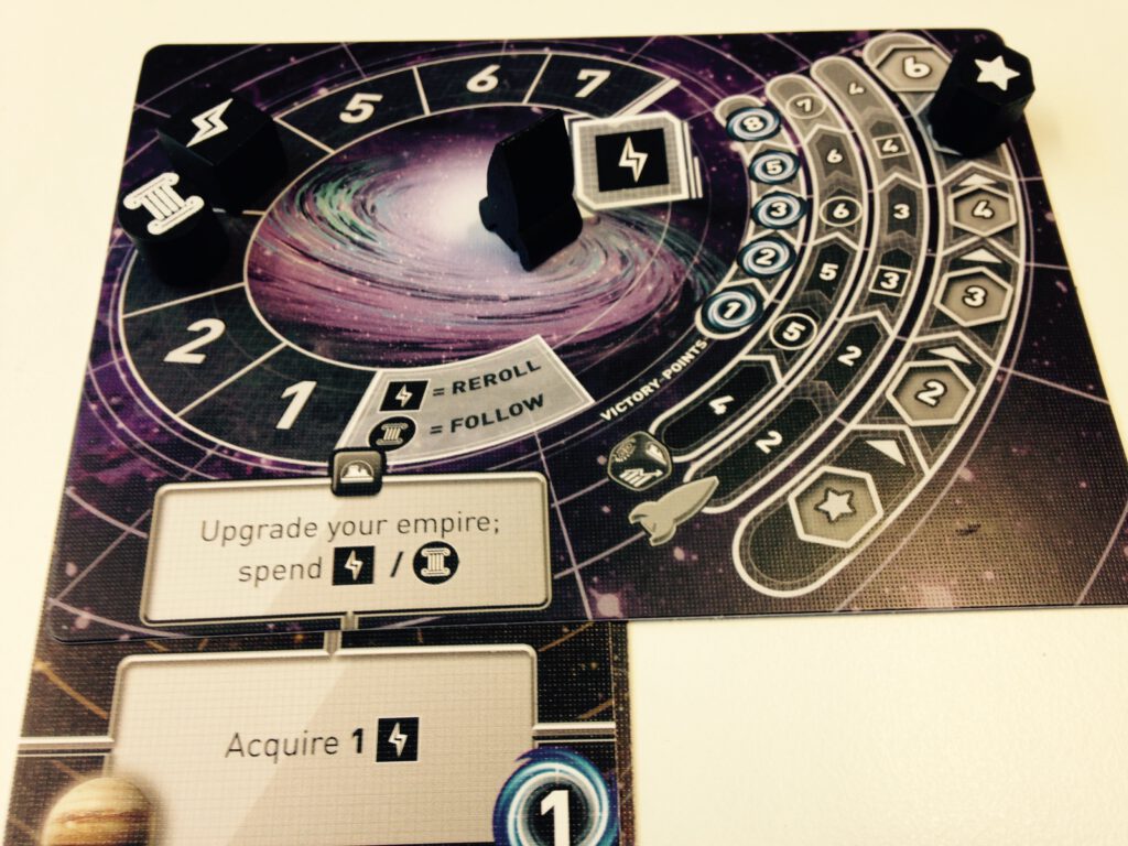 You can also push up your power and culture on your home planet with the dice. The benefit of this is twofold: first, if you have rolled the right dice to do so, you can use either power or culture to upgrade: getting you more dice to roll, more ships, and more points. This is crucial. Secondly, power can be spent on your turn to give you a preroll of any unused dice, and culture can be spent during the other players turns to copy their move! This is a rather nifty mechanism that puts Tiny Epic Galaxies above many roll-dice-to-get-stuff type games.
