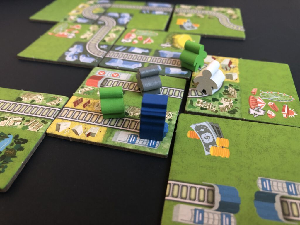 In Traintopia, each player is building their own train track – or tracks – by laying tiles together into their own play area. You score points in a number of ways, both during and at the end of the game, and the player with the most points wins.