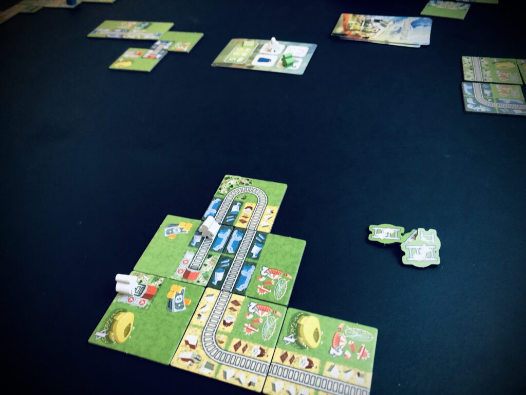 Each player starts with a couple of tiles in place already, and over the course of 8 or 9 rounds, there’s a drafting phase when a number of tiles and passengers are revealed, potentially along with trains and mailbags. Everyone in turn takes first one, and then a second item from what’s available, and adds it to their track.