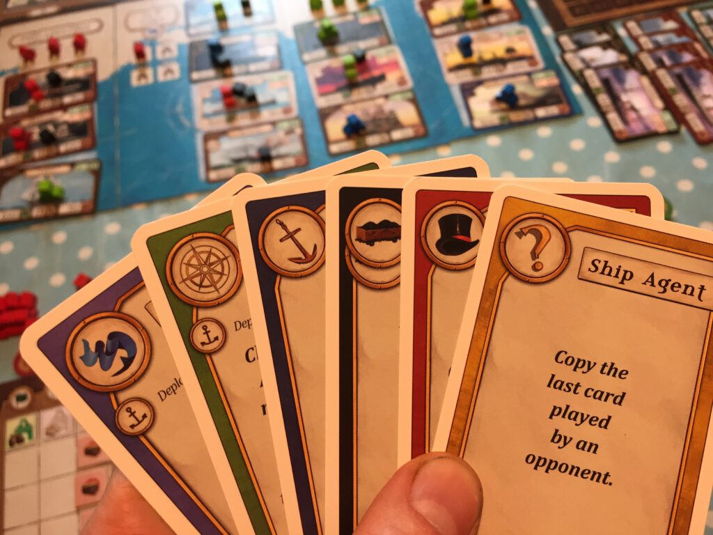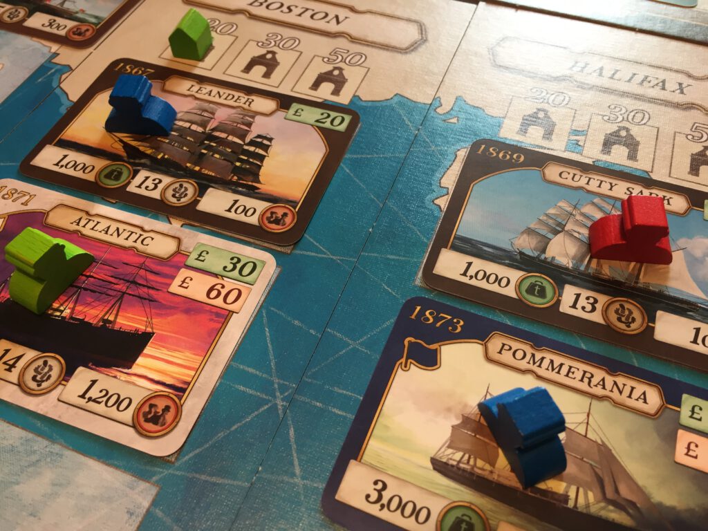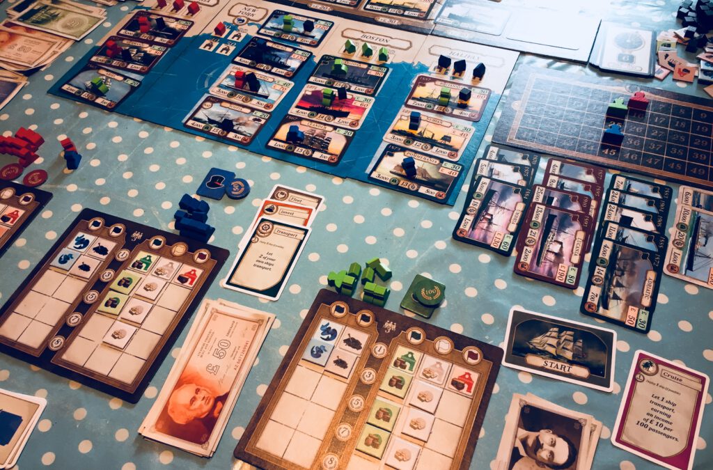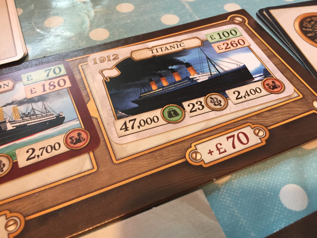 There’s a few things we’ve glossed over, such as the Blue Riband shares for fastest ship and the end-game investment scoring, but this gives you a reasonable overview. Though I think this designer’s Concordia (originator of the card system that Transatlantic borrows from) is kind of a classic, it is also pretty dry – no pun intended – and I was hoping Transatlantic might have a more engaging narrative. For me it’s a mixed success – I do feel there’s a smidgen more story here than the slightly abstracted-feeling predecessor, but it suffers from an underwhelming appearance (the ship cards are great, but that attention to detail doesn’t seem to be applied anywhere else) and a feeling that the game goes on a little longer than it should. The scoring at the end is a bit fiddly as well. But I do enjoy it – like Concordia, everyone is busy with their own plans until they find someone has – inadvertently or not – sabotaged them. There’s a successor game called Crossing Oceans I’ve not played, which brings in a board to play on with more presence – and a sense of geography missing here.